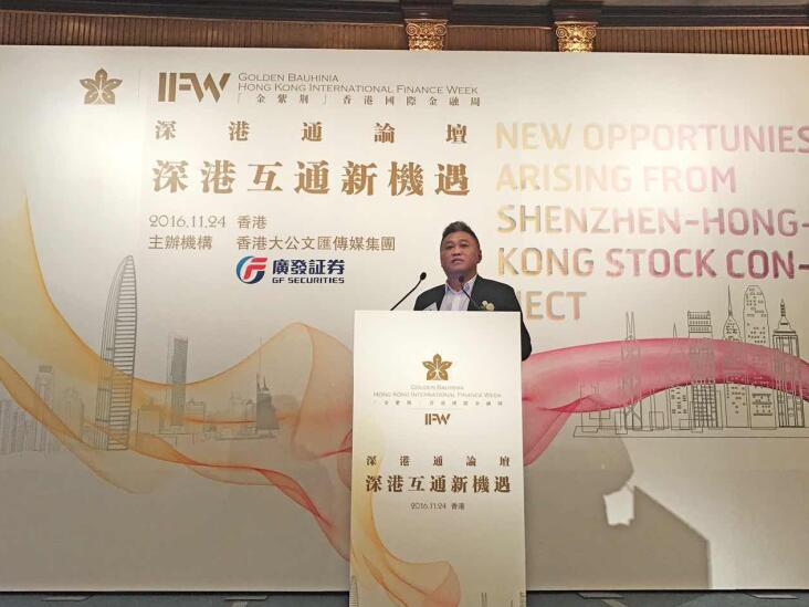 图:11月24日下午,谢粤辉先生于“金紫荆”香港国际金融周“深港通论坛”上演讲