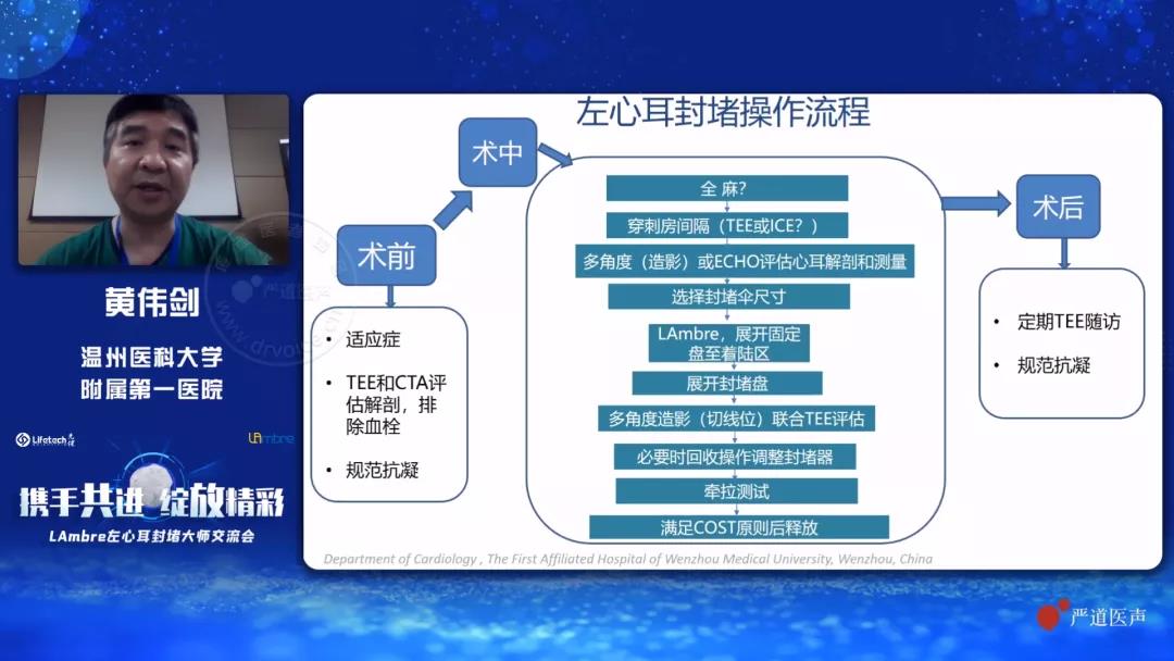 紧接着,温州医科大学附属第一医院的黄伟剑教授分享了LAmbre™左心耳封堵器系统于其所在中心的植入数据与临床使用经验,并为大家详细解读了左心耳封堵的标准操作流程。黄教授强调,LAmbre™在保证手术安全性的同时,有着丰富的型号选择,能够应对各种不同的左心耳解剖结构,封堵器的适用范围更广,且释放精准度和植入成功率更高,为患者及医生提供了更优的治疗选择。