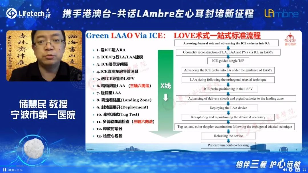 宁波市第一医院储慧民教授为大家分享了ICE(心腔超声)引导下的LAmbre™左心耳封堵器植入过程。与TEE(经食道超声)相比,ICE不受食道与心耳开口方向的限制,通过“三轴六向法”可以完整扫描心耳的体部和口部,全维度评估左心耳解剖结构,为手术的开展提供更精准的指导。储教授通过展示在ICE引导下采用LAmbre™进行的左心耳封堵手术案例,生动地向大家介绍了“零射线”手术的全过程。储教授表示,作为盘式左心耳封堵装置,LAmbre™拥有独特的U型勾锚定机制,对心耳深度依赖较小,能够有效避开ICE的技术盲点,为绿色封堵技术的实现提供了基础。