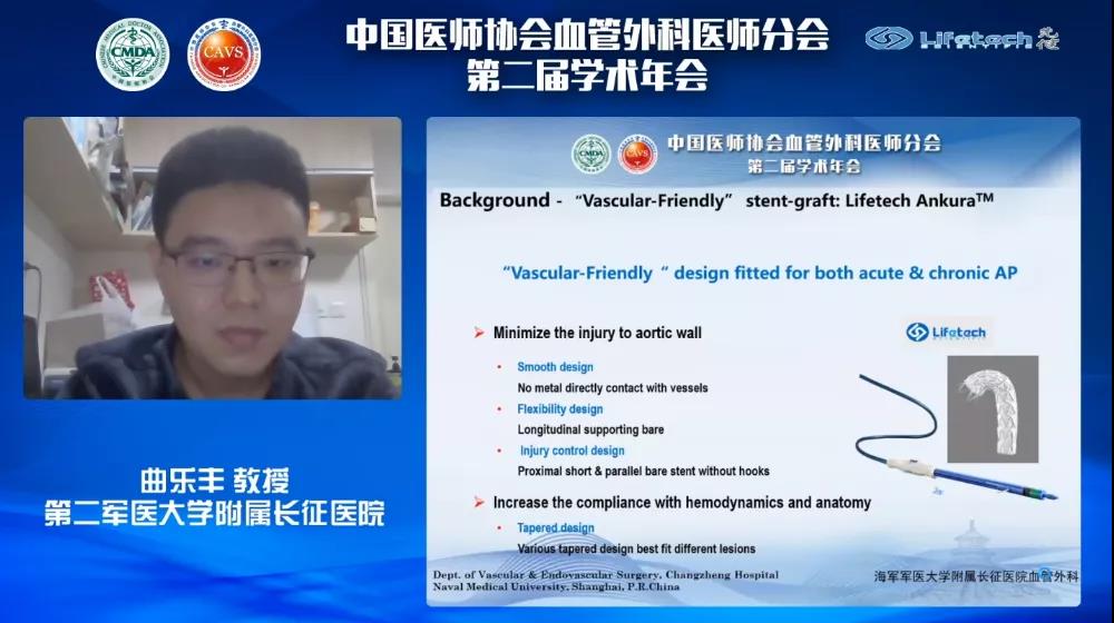 曲乐丰教授团队的吴鉴今医生以《Perfect TEVAR with ANKURA-我的思考与策略》为题分析了2013年至2016年期间126例胸主动脉病变治疗研究中,Ankura™胸主动脉覆膜支架在TEVAR(胸主动脉腔内修复术)中的临床应用优势。吴医生表示,不同类型的主动脉疾病需要针对性的支架设计,Ankura™采用双层e-PTFE覆膜,即刻封堵效果出色;其“血管友好型”设计,具有更好的顺应性和最低的血管损伤;多种锥度设计,可适应各种主动脉夹层病变的解剖形态。研究结果表明,Ankura™支架独特的产品特性和设计理念,针对慢性和急性主动脉病变的临床应用安全有效。