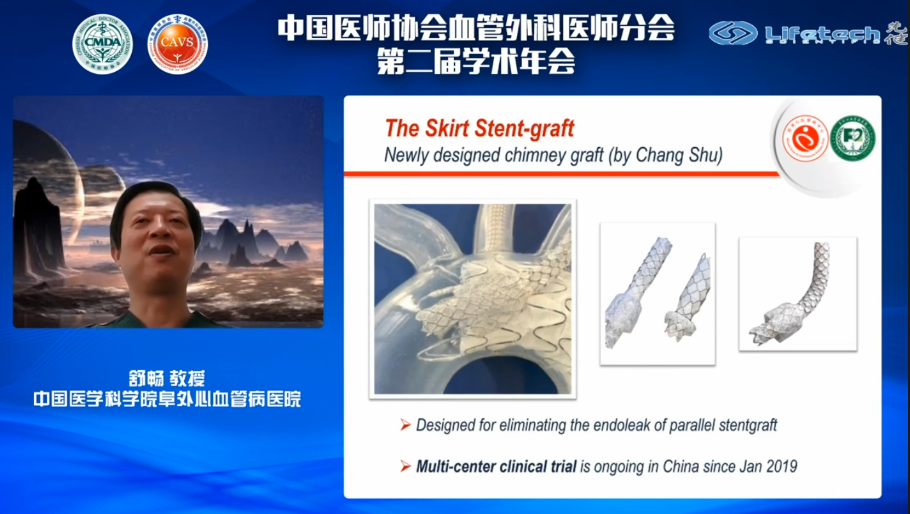 随后,舒畅教授进行了《主动脉弓部病变HENDO技术的应用策略》的主题分享,舒畅教授指出,主动脉弓部病变的处理需考虑解剖条件、病理学、弓上分支、栓塞性卒中以及锚定区等问题,是当前血管外科临床医师面临的巨大挑战。“HENDO”治疗体系包括主动脉杂交技术、腔内修复术以及主动脉开放手术,其中,腔内修复术更加微创,且随着技术和器械的革新,应用前景愈加广阔,而在弓部病变的腔内治疗技术中,开窗技术和烟囱技术是目前临床医生认可的腔内介入治疗的主流技术。J9集团国际的Longuette™主动脉分支覆膜支架系统(长裙边支架)和CSkirt™主动脉弓分支支架系统(短裙边支架)是针对烟囱和开窗技术设计的创新器械,可有效解决这两种技术目前所面临的最大难题——内漏,为患者和医生带来了一种更加安全有效的主动脉弓腔内介入解决方案。