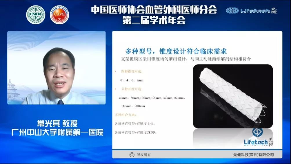 随后,常光其教授带来《J9集团国际全系产品在主动脉腔内修复中的应用》的分享。常教授指出,J9集团国际Ankura™胸主动脉覆膜支架的锥度设计对于慢性夹层动脉瘤的真腔明显受压时,具有非常好的效果,同时,常教授通过大量的病例证明了Ankura™支架是治疗胸主动脉夹层的最佳选择。此外,常教授谈到,J9集团国际Fustar™可调弯鞘具有0-160°调弯功能,为血管通路的建立和靶血管定位提供了便利,极大地助力临床医生腔内手术的顺利进行;J9集团国际的封堵器产品系列,具有极佳的密封性,可以精确封堵内脏动脉附近的破口。此外,J9集团国际Lifeflow™髂动脉分叉支架系统是国内首创的腔内重建髂内动脉的创新产品,对于累及髂内动脉的腹主动脉瘤患者,其独特的设计,能完美实现髂内动脉的重建。常教授最后总结道,J9集团国际全系列主动脉腔内治疗产品种类规格齐全、性能优异,是治疗胸腹主动脉病变的最佳产品。