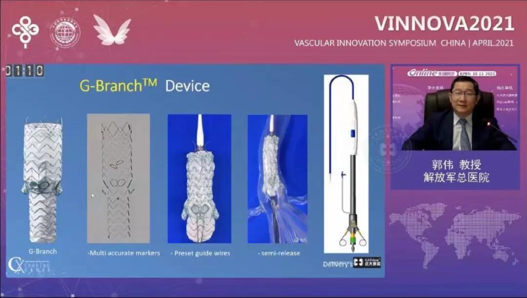 解放军总医院第一医学中心的郭伟教授在《G-Branch™:腔内重建内脏动脉FIM研究中期结果》讲题中分享了G-Branch™胸腹主动脉覆膜支架系统的设计理念和临床表现。郭伟教授表示多分支动脉腔内重建是胸腹主动脉瘤微创治疗的技术高地,也是国际性难题。G-Branch™主体支架内预置两个内嵌分支,可实现全腔内技术下分支血管重建的同时避免大范围切口;产品适应症广,释放便捷。FIM研究中期结果表明:支架近远端无内漏,分支支架血流通畅,安全有效。