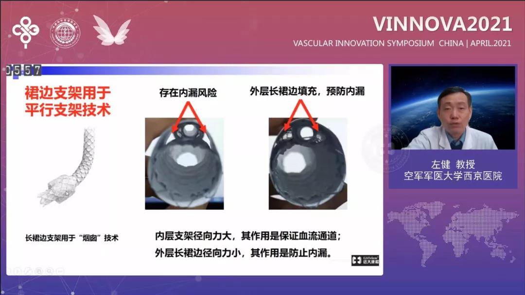 空军军医大学西京医院左健教授在《累及弓部主动脉病变的治疗策略及进展》对比了不同的技术在处理弓部病变的优势、结果及进展,并通过5例应用Longuette™裙边支架重建弓上分支的成功经验,表明了裙边烟囱支架外柔内刚的设计可有效避免普通烟囱术式的内漏问题。左教授总结道,伴随弓部腔内支架及技术的日渐完善,全腔内时代即将到来。