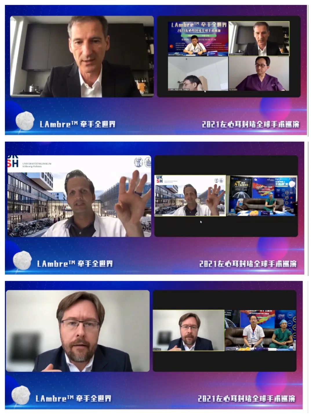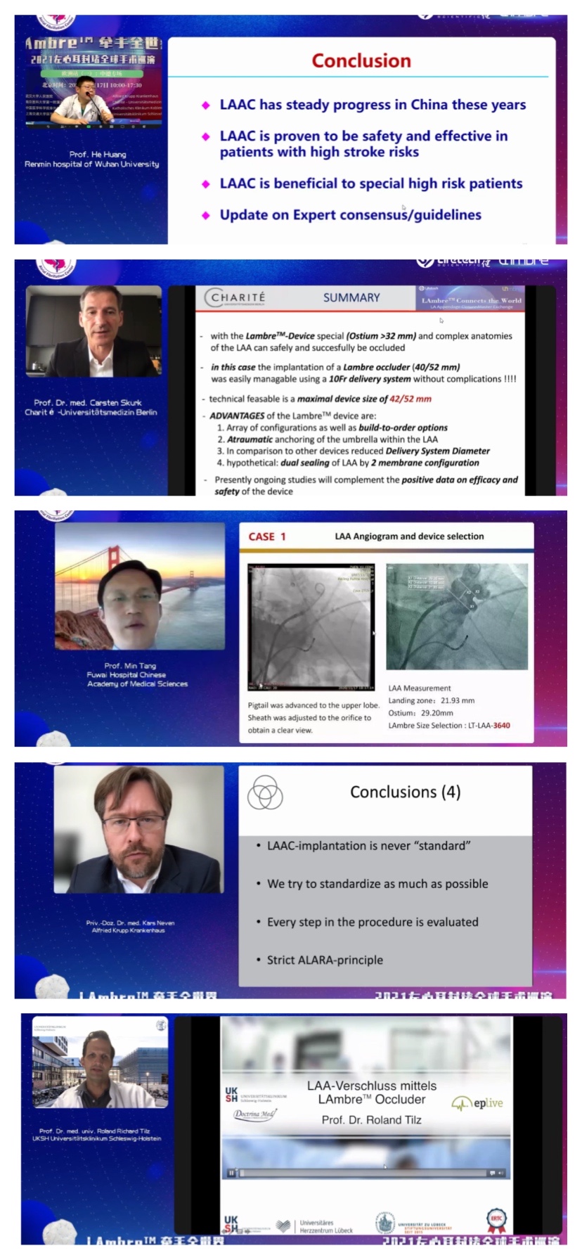 LAmbre™牵手全世界活动特别邀请到中国房颤中心联盟主席黄从新教授以及德国科布伦茨和蒙塔鲍尔地区天主教联合医疗中心余江涛教授作为大会主席,同时邀请武汉大学人民医院黄鹤教授团队、南京医科大学附属第一医院陈明龙教授团队、中国医学科学院阜外医院唐闽教授、上海交通大学医学院附属仁济医院卜军教授团队、南昌大学第二附属医院陈琦教授,与来自德国各个地区和中心的专家,包括:Carsten Skurk教授、Roland Richard Tilz教授、Kars Neven教授等众多心内科专家齐聚云端,共同交流和分享现阶段左心耳封堵的诊疗策略。