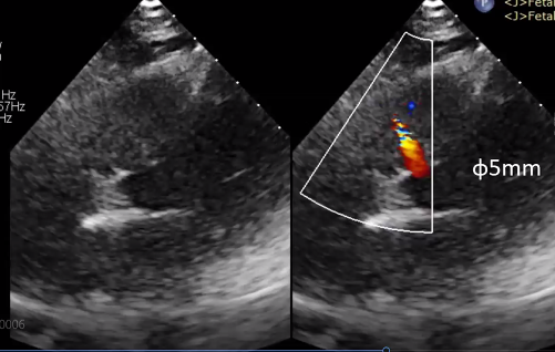 经检查诊断为膜部VSD,术前超声测量VSD缺损直径为5mm,轻度左心室容量超负荷,左心室舒张末期内径51mm。