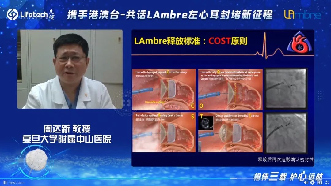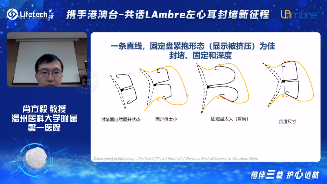 武汉亚洲心脏病医院苏晞教授循序渐进地分享了采用LAmbre™进行左心耳封堵术的标准操作流程以及术中要点与技巧,尤其着重介绍了房间隔穿刺点的选择、术中轴向调整等关键步骤,以及对特殊左心耳解剖结构的封堵策略等。苏教授强调,术前进行充分的影像学评估是至关重要的步骤,其对具体手术方案的设计有指导性意义。