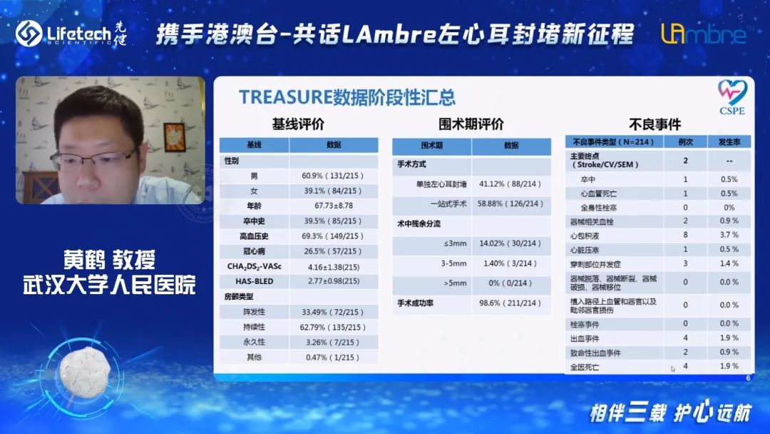 武汉大学人民医院黄鹤教授向大家展示了TREASURE研究(LAmbre™左心耳封堵器系统真实世界临床)的阶段性结果。截止目前,该项目已持续开展了近两年,相关数据进一步证明了LAmbre™左心耳封堵器系统用于房颤卒中防治的安全、有效性。同时,LAmbre™可满足对于不同心耳解剖结构的封堵要求,适用患者人群更广,是房颤卒中患者的理想选择。