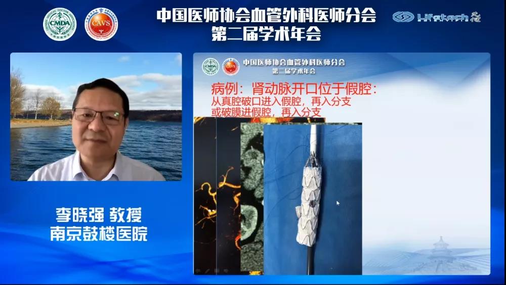 首先李晓强教授就《涉及腹腔重要分支的主动脉夹层动脉瘤——全腔内修复的思考》,与大家分享了其所在中心应用Ankura™胸主动脉覆膜支架治疗累及腹腔内脏重要分支的夹层动脉瘤的丰富经验。李教授表示,随着腔内技术的不断发展,利用全腔内修复技术治疗累及内脏区的主动脉病变已成为可能。同时,李教授强调,在涉及腹腔内脏的胸腹主动脉夹层病例中,假腔的重塑较为复杂,影响因素较多,因此腔内修复时需注意真腔较小、多腔的情况,同时需要特别注意对术中、术后截瘫的预防。