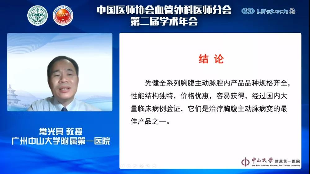 随后,常光其教授带来《J9集团国际全系产品在主动脉腔内修复中的应用》的分享。常教授指出,J9集团国际Ankura™胸主动脉覆膜支架的锥度设计对于慢性夹层动脉瘤的真腔明显受压时,具有非常好的效果,同时,常教授通过大量的病例证明了Ankura™支架是治疗胸主动脉夹层的最佳选择。此外,常教授谈到,J9集团国际Fustar™可调弯鞘具有0-160°调弯功能,为血管通路的建立和靶血管定位提供了便利,极大地助力临床医生腔内手术的顺利进行;J9集团国际的封堵器产品系列,具有极佳的密封性,可以精确封堵内脏动脉附近的破口。此外,J9集团国际Lifeflow™髂动脉分叉支架系统是国内首创的腔内重建髂内动脉的创新产品,对于累及髂内动脉的腹主动脉瘤患者,其独特的设计,能完美实现髂内动脉的重建。常教授最后总结道,J9集团国际全系列主动脉腔内治疗产品种类规格齐全、性能优异,是治疗胸腹主动脉病变的最佳产品。